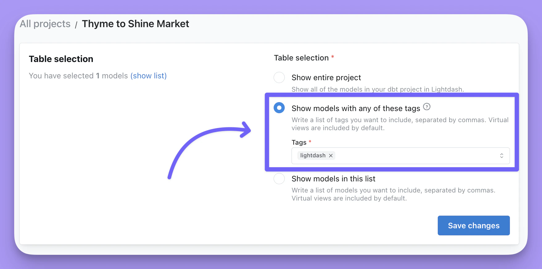 3. Show models in this list: If you’re not keen on using tags then you can manually select the models you want to include as Tables in your Lightdash project using this option.