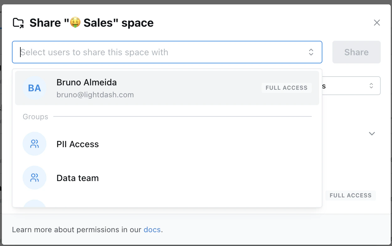 Users with Full Access to a space can restrict and increase a user’s inherited project permissions in a space (e.g. you can make project editors into can view in a space). Space permissions determine which users can edit space contents (charts and dashboards), view the contents in a space, and change a space’s settings: